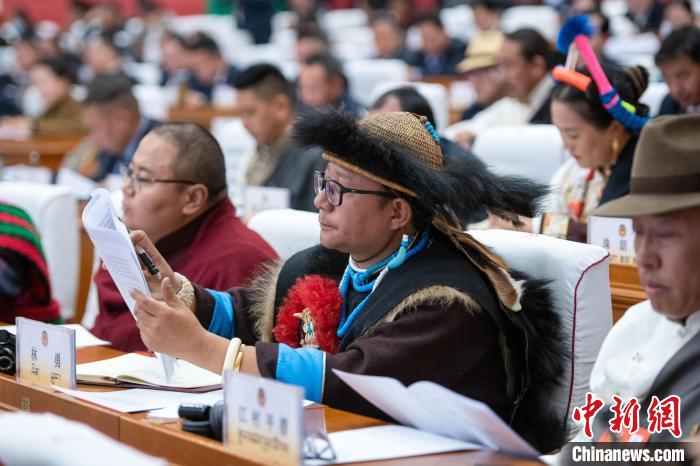 1月6日,西藏自治區(qū)兩會現場,珞巴族政協(xié)委員林勇(中間者)參會。中新社記者 貢嘎來松 攝