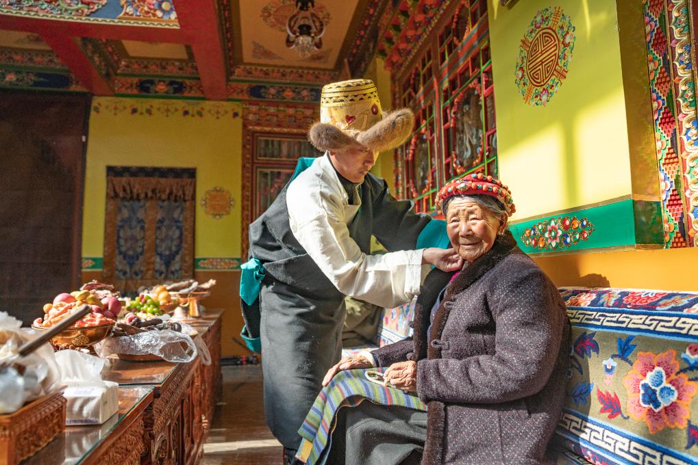 按照傳統(tǒng)習(xí)俗,巴桑普尺一家人盛裝迎新。男性長輩外著氆氌藏袍,頭頂金絲帽,腳蹬藏靴;女性長輩身穿真絲綢緞衫,搭配無袖藏袍,胸前佩戴綠松石、瑪瑙、珊瑚等首飾;小輩們也都穿上了嶄新藏裝。