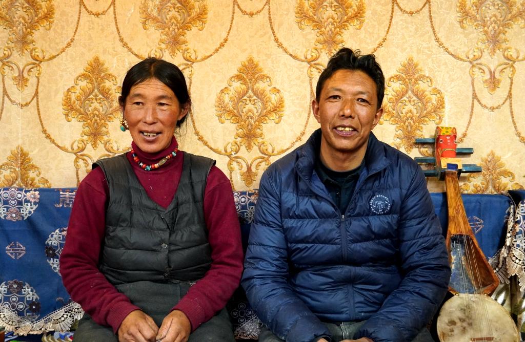 札達縣楚魯松杰鄉(xiāng)巴卡村巴角組村民歐珠多吉夫婦在新房客廳合影(1月14日攝)。新華社記者陳尚才 攝