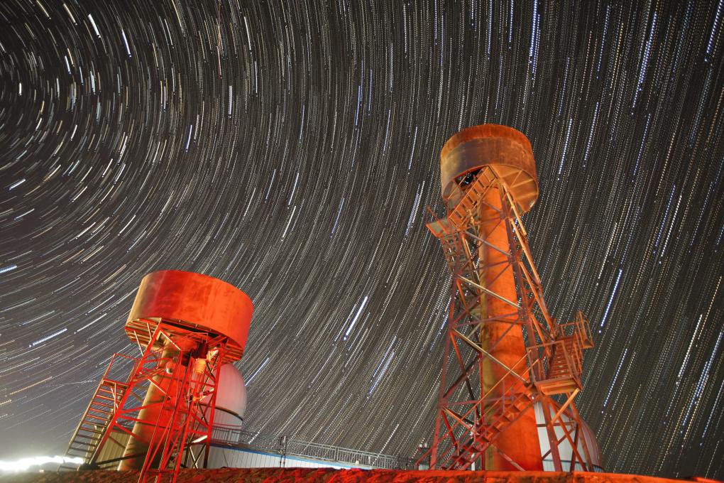 在拍攝天文臺星軌時也有一些有趣的瞬間:天已經完全黑了,在相機取景器里并不能實時地看見天空、星星以及其他拍攝對象,這時候我們只能先長曝光拍一張圖,結合已拍好的圖,根據(jù)自己的感覺慢慢調整構圖,再進行曝光拍攝。如此經過三四次長曝光拍攝以后,才能拍到自己想要的圖片。我的星軌照片就是這樣拍攝出來的。