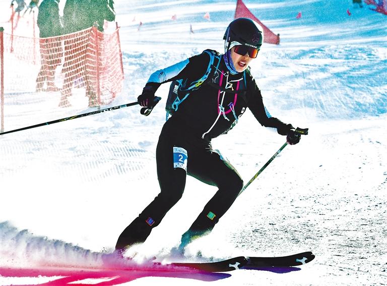 在滑雪登山項目公開組混合接力比賽中,賽道全長1100米,呈字母Y形,累計爬升130米。選手們分別需要完成兩次穿板上升、轉(zhuǎn)換下滑,然后在接力區(qū)身體觸碰完成接力。