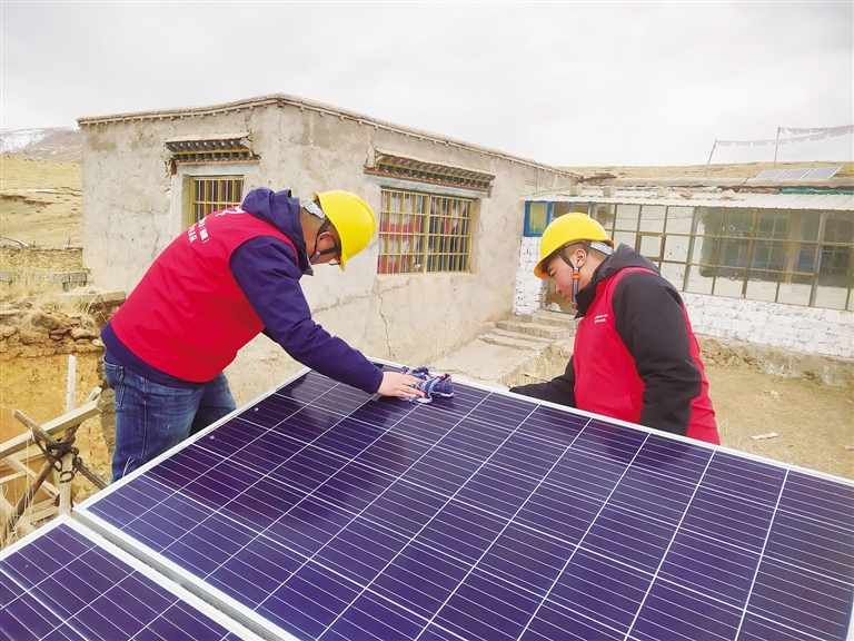 “次桑在家嗎?我們過來看一下你們新年準(zhǔn)備得怎么樣了?”聽到劉光輝的呼喚,孩子們都跑出來迎接這位“小黃帽”叔叔。劉光輝和羅桑歐珠進(jìn)屋放下年貨,顧不上休息,立馬搭梯子爬上次桑家的房頂,用抹布拂去光伏電板上的塵土,拿出工具仔細(xì)檢查電源和光伏設(shè)備是否有損壞?!按紊<矣玫氖俏覀兊牡谝淮柲芄夥姲?,這個電板要經(jīng)常擦拭,保持表面干凈,發(fā)電效率會更好?!眲⒐廨x說。檢修完光伏電板后,劉光輝和羅桑歐珠又回到屋內(nèi)檢查次桑家的電路線路,對插排插座等可能存在安全隱患的地方進(jìn)行認(rèn)真排查。確保沒有問題后,兩人將之前昏暗的燈泡全部換成了最新的節(jié)能燈泡,整個屋子一下亮堂了起來。