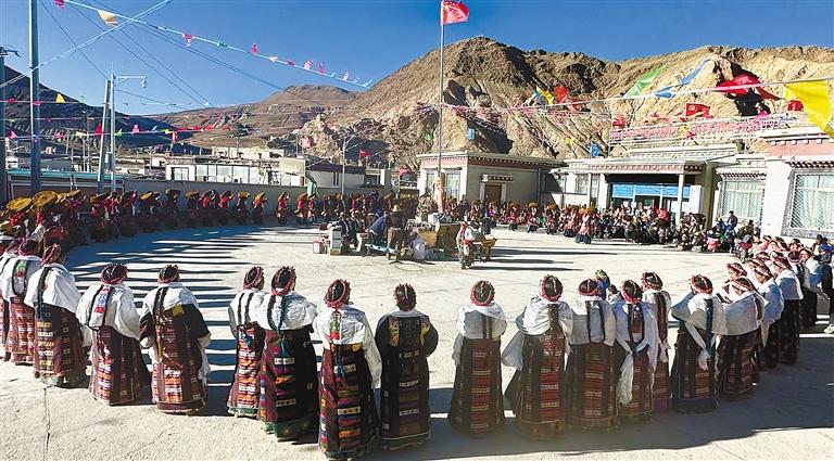 新春佳節(jié),日喀則市聶拉木縣門布鄉(xiāng)門卡麥村的村民們身著華麗的服飾翩翩起舞,以飽滿的熱情將“甲諧”(意為隆重的歌舞表演)的獨特魅力展現(xiàn)得淋漓盡致,以此來慶賀新年的到來。 圖為演出現(xiàn)場。西藏日報記者 格桑倫珠 攝
