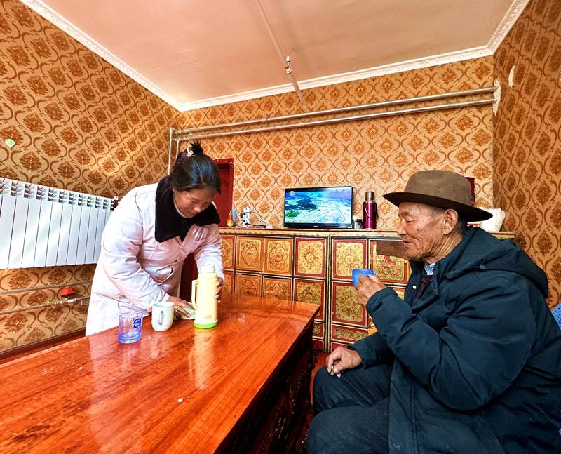 央珍是集中供養(yǎng)中心的護理員,來這邊工作已有7年了。剛到供養(yǎng)中心,央珍簡單地以為這就是一份搞衛(wèi)生的工作,然而在實際中不曾想照顧老人是多么繁瑣復(fù)雜,需要全身心投入,“剛開始我和阿媽瓊拉他們也不熟,每天在老人家干完自己的活,也不會留下來陪他們說說話?!毖胝湔f,有一次在照顧瓊拉老人時,老人嘀咕了一句:“來這兒也沒個人陪我說話,這跟家里一個人沒啥差別嘛!”央珍聽到后頓時有點愧疚和難過,央珍心想:“這些老人身世都比較可憐,家里基本都是一個人,來這兒不僅是因為這兒的條件,更是不愿意獨自面對孤零零的家。”自此,央珍每天不僅照顧瓊拉老人的生活起居,更成為了老人們的貼心“好女兒”。