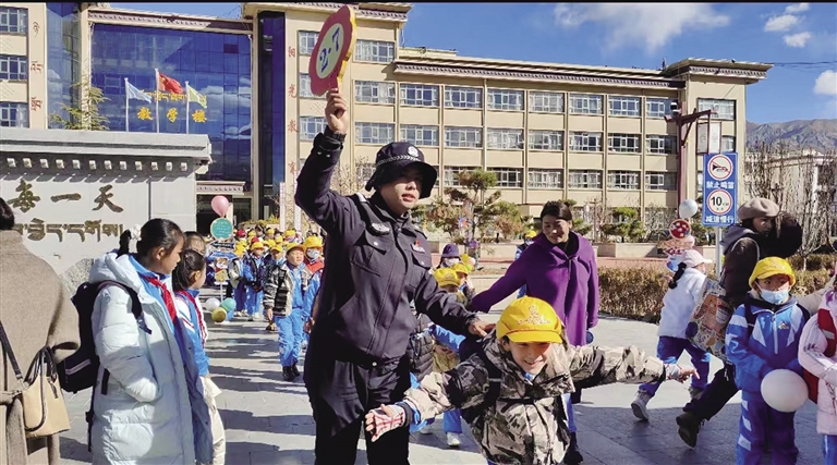 站在學(xué)校門口,等待孩子的家長央金感觸頗深,她告訴記者,每次開學(xué)前、開學(xué)時(shí)、開學(xué)后,都能看到民警們忙碌的身影。為學(xué)校家長提供幫助,為學(xué)生消除安全隱患,營造了安全、和諧、文明的校園環(huán)境,十分感謝他們?!敖裉靾?bào)到啦,我們看到警察叔叔和阿姨就覺得很安心、很開心?!睂?shí)驗(yàn)小學(xué)3年級10班學(xué)生白瑪娜薩說。