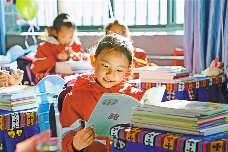 阿里地區(qū)陜西實驗學校開學第一天,孩子們開心閱讀新課本。記者 洛桑旦增 達珍 永青 攝