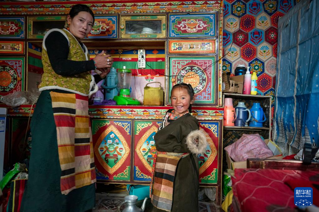 丹增的母親嘎宗(左)和4歲的小妹妹拉姆卓瑪在牧場上的老家打酥油茶(2023年12月18日攝)。新華社 姜帆 攝
