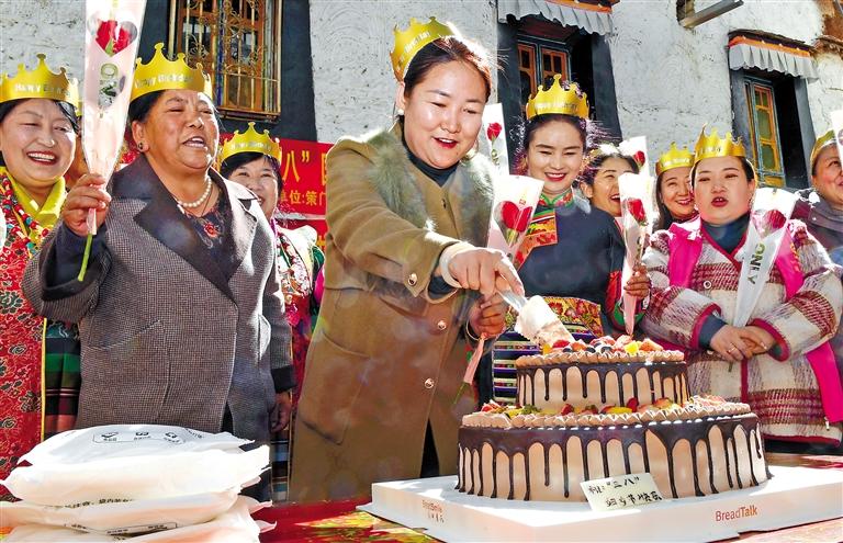 為進(jìn)一步豐富社區(qū)婦女同胞的精神文化生活,展示社區(qū)巾幗風(fēng)采,3月8日,拉薩市策門林社區(qū)和藥王山社區(qū)共同舉辦了“巾幗心向黨 奮進(jìn)新征程‘三八’國際勞動(dòng)?jì)D女節(jié)”活動(dòng),轄區(qū)婦女歡聚一堂,慶祝節(jié)日。圖為轄區(qū)女性共同切蛋糕慶祝節(jié)日。 旦增蘭澤 攝
