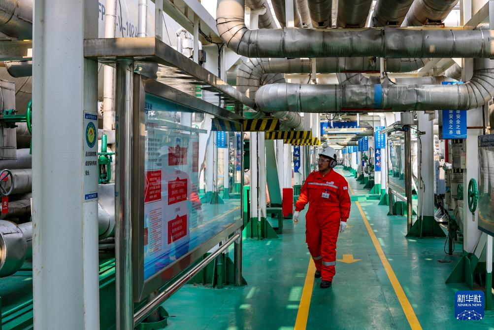強(qiáng)巴在秦皇島32-6油田“渤海世紀(jì)號”(FPSO)16萬噸級浮式生產(chǎn)儲油裝置上對責(zé)任區(qū)域進(jìn)行日常巡檢(3月7日攝)。新華社記者 姜帆 攝