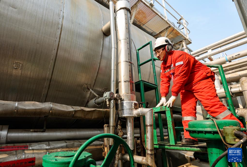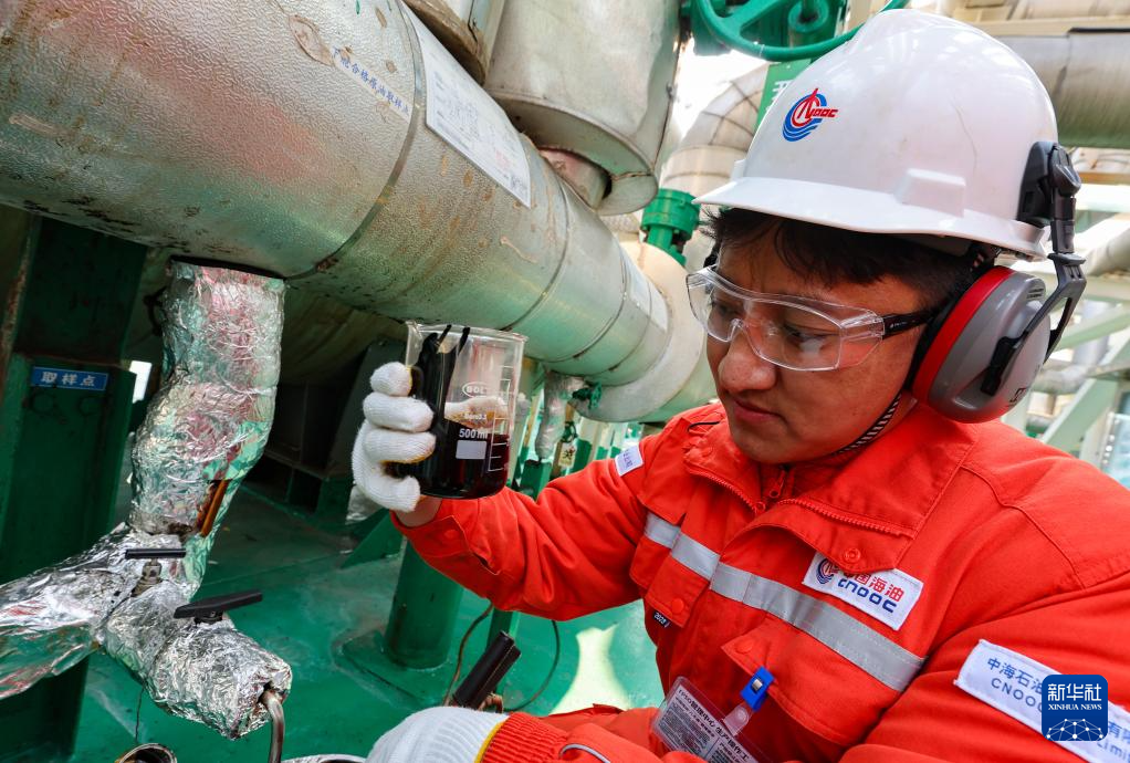 強(qiáng)巴在秦皇島32-6油田“渤海世紀(jì)號”(FPSO)16萬噸級浮式生產(chǎn)儲油裝置上檢查原油油樣(3月7日攝)。新華社記者 姜帆 攝