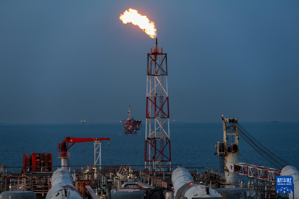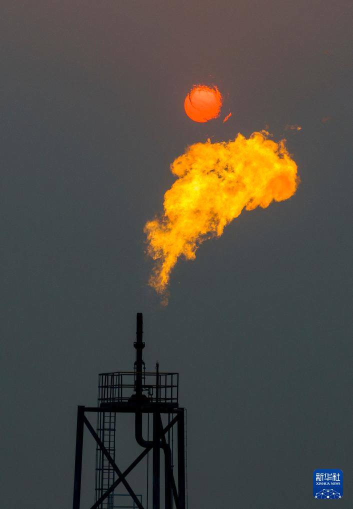夕陽下的秦皇島32-6油田“渤海世紀(jì)號”(FPSO)16萬噸級浮式生產(chǎn)儲油裝置的火炬(無人機(jī)照片,3月7日攝)。新華社記者 姜帆 攝