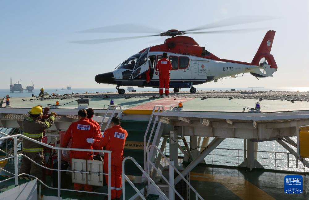 直升機(jī)在秦皇島32-6油田“渤海世紀(jì)號”(FPSO)16萬噸級浮式生產(chǎn)儲油裝置上降落(3月7日攝)。這是海上石油工人經(jīng)常使用的交通工具。新華社記者 黃耀漫 攝