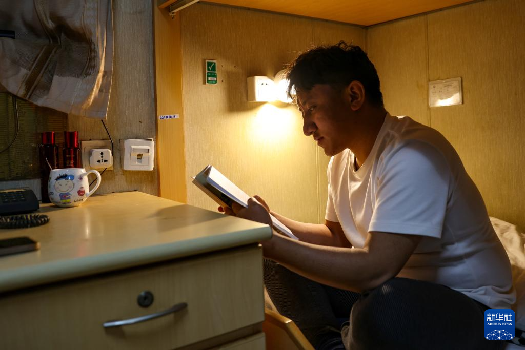 強(qiáng)巴在秦皇島32-6油田“渤海世紀(jì)號”(FPSO)16萬噸級浮式生產(chǎn)儲油裝置上休班的時候進(jìn)行業(yè)務(wù)學(xué)習(xí)(3月7日攝)。現(xiàn)在他正準(zhǔn)備中級操作工資格的考試。新華社記者 姜帆 攝