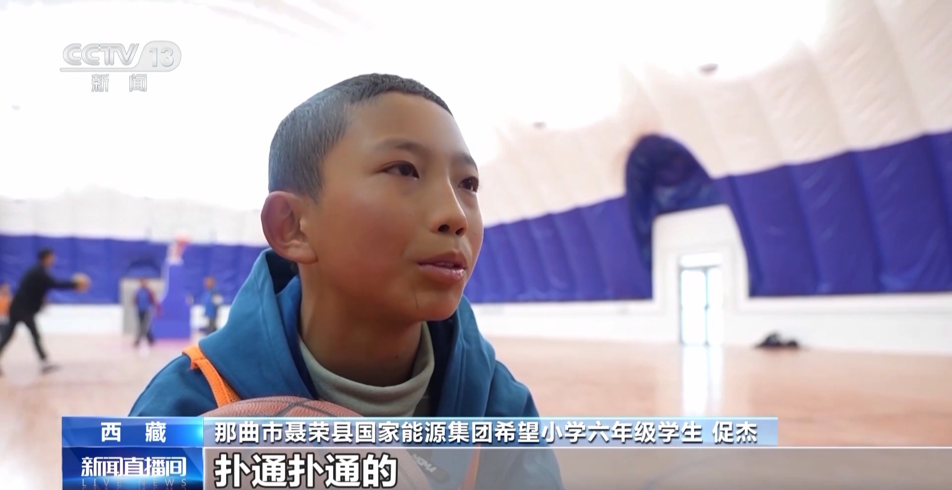 正在新球館進(jìn)行籃球訓(xùn)練的促杰,是聶榮縣國家能源集團(tuán)希望小學(xué)六年級學(xué)生。他的家在離縣城18公里的色慶鄉(xiāng),平常住在學(xué)校。從三年級開始,促杰開始喜歡上籃球。然而,這里高寒缺氧,晝夜溫差大,全年日均最高溫僅7攝氏度,孩子們無法進(jìn)行長時間的訓(xùn)練。此前學(xué)校僅有的露天球場,更是常常受天氣影響,無法使用。