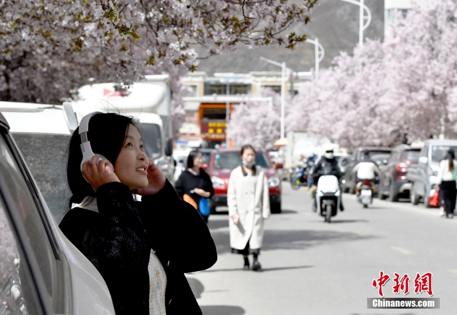 4月1日,市民在春花綻放的道路旁賞花。隨著雪域高原天氣回暖,西藏拉薩市區(qū)各條道路春花綻放。因道路兩側(cè)繁華似錦,拉薩市城關區(qū)軍民路成網(wǎng)紅打卡地,市民游客紛紛前來打卡拍照。中新社記者 李林 攝
