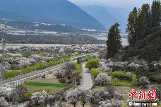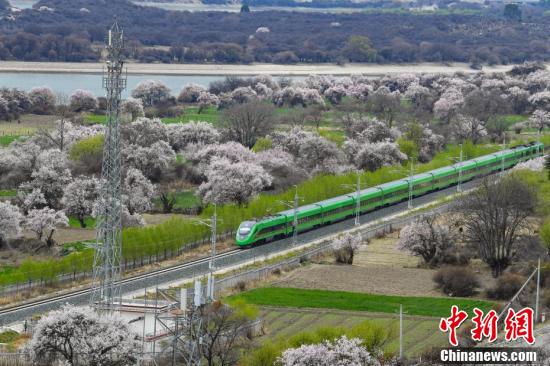3月下旬至4月,西藏拉薩至林芝鐵路(拉林鐵路)沿線綿延的野生桃花林盛開(kāi),復(fù)興號(hào)動(dòng)車(chē)組穿行在桃花海間,成為拉林鐵路春天最美的點(diǎn)綴。圖為穿梭在桃花林中的拉林鐵路高原復(fù)興號(hào)。