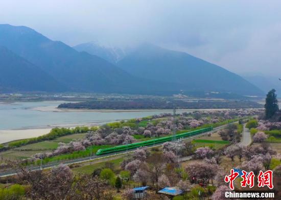 穿梭在桃花林中的拉林鐵路高原復(fù)興號(hào)。