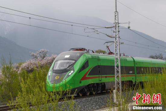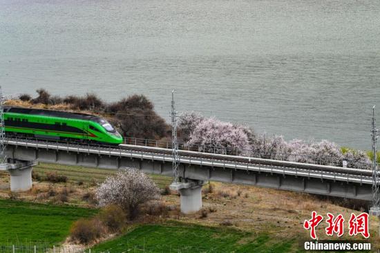 復(fù)興號(hào)動(dòng)車(chē)組不僅是一種便捷的交通方式,更成為了一種獨(dú)特的旅游體驗(yàn),讓游客能夠近距離欣賞到西藏林芝春季獨(dú)特的自然美景。圖為穿梭在桃花林中的拉林鐵路高原復(fù)興號(hào)。
