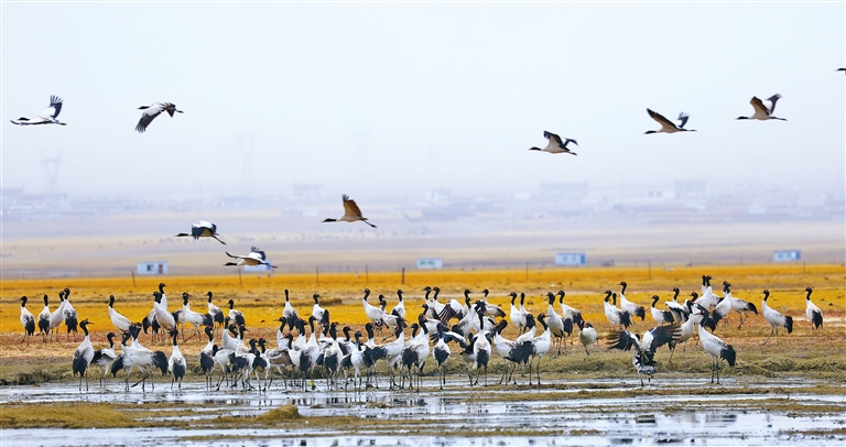 黑頸鶴在阿熱濕地棲息。益西旦增 攝