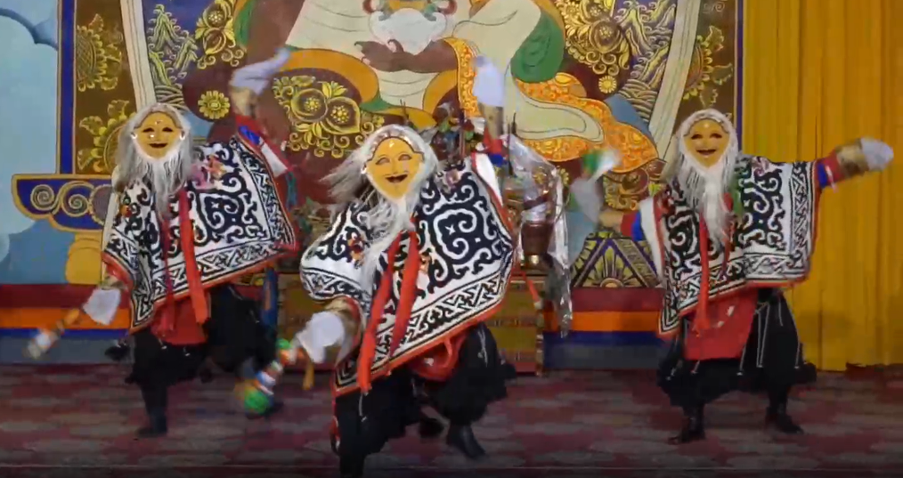 傳統(tǒng)藏戲的服裝從頭到尾只有一套,演員無需化妝,主要是戴面具表演。整體上看,藏戲分為白面具戲和藍(lán)面具戲。在同一臺(tái)藏戲中,又會(huì)出現(xiàn)紅、白、藍(lán)、黑、黃等不同顏色面具,代表不同身份?!氨热缢{(lán)色面具代表獵人,黃色面具代表高僧、官員等?!蹦岈敶稳收f。以戴黃色面具為主的扎西雪巴是白面具藏戲的杰出代表。