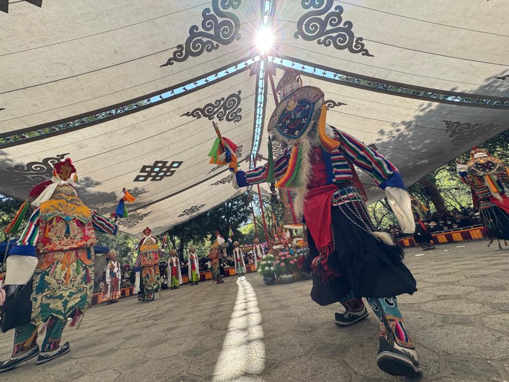 廣場中央戲臺(tái)上,鼓點(diǎn)輕快、鈸聲鏗鏘,戴著黃面白發(fā)面具的藏戲演員唱腔高亢激昂;臺(tái)下,觀眾聚精會(huì)神,不時(shí)隨著演員表演一起大笑。