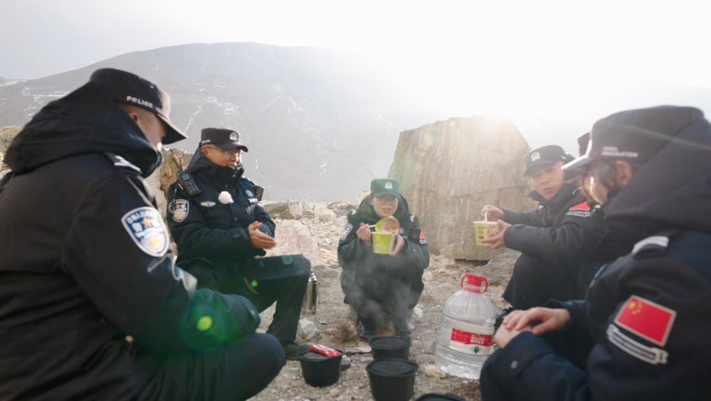 經過4個多小時的高海拔行走,巡邊隊伍終于到達了6000米的巡邏折返點位,也到了巡邏路上的快樂時刻,吃火鍋!“現在后勤保障到位,無論在野外何處,吃頓熱飯已不是難事”,帶隊的副所長次仁加措說道。
