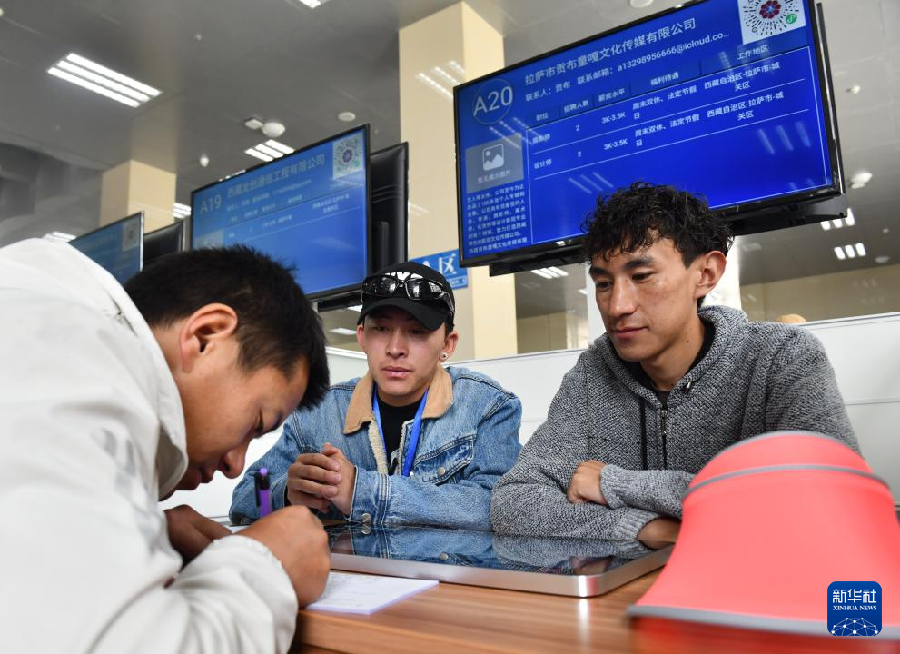 5月24日,在招聘會(huì)現(xiàn)場,求職者(左)在給用人單位填寫個(gè)人資料。新華社記者 晉美多吉 攝