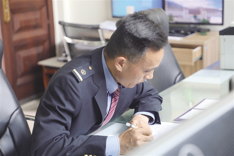 “這里的工作雖然看似單調(diào),實(shí)則責(zé)任很大?!辟R文貴身穿深藍(lán)色的鐵路制服,胸前佩戴著亮閃閃的工牌,顯得精神抖擻。他像一名嚴(yán)謹(jǐn)?shù)膽?zhàn)士,緊盯著操作臺(tái),確認(rèn)信號(hào),口呼手指?!∽鳛檐囌局蛋鄦T,賀文貴每天的任務(wù)主要是監(jiān)視列車進(jìn)路和區(qū)間動(dòng)態(tài),保證行車安全。工作中的他認(rèn)真負(fù)責(zé),嚴(yán)格執(zhí)行標(biāo)準(zhǔn)化作業(yè),他常說:即使單人值守,該有的程序、作業(yè)步驟一項(xiàng)都不少,作業(yè)標(biāo)準(zhǔn)必須嚴(yán)格執(zhí)行,保證作業(yè)安全。