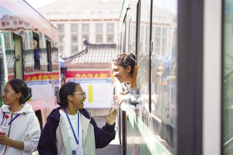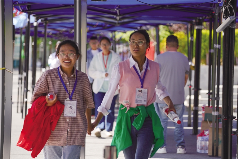 擊掌、擁抱……拉薩中學(xué)考點附近處處是為考生們加油的老師、家長。有些家長身著旗袍,有的老師手拿向日葵……給孩子加油打氣。