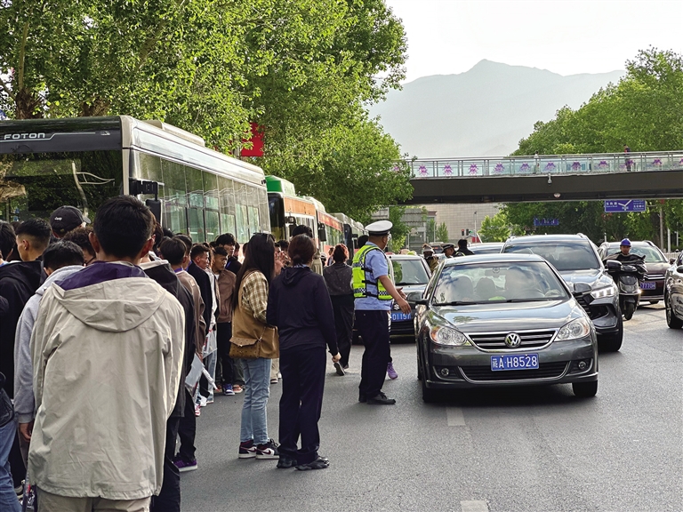 6月7日8點,太陽剛剛升起,拉薩中學(xué)考點附近人頭攢動。一輛輛愛心送考的公交車依次??吭隈R路邊,學(xué)生們排隊等候安檢進場,考點大門口的喇叭重復(fù)播放著考生進考場的溫馨提示。