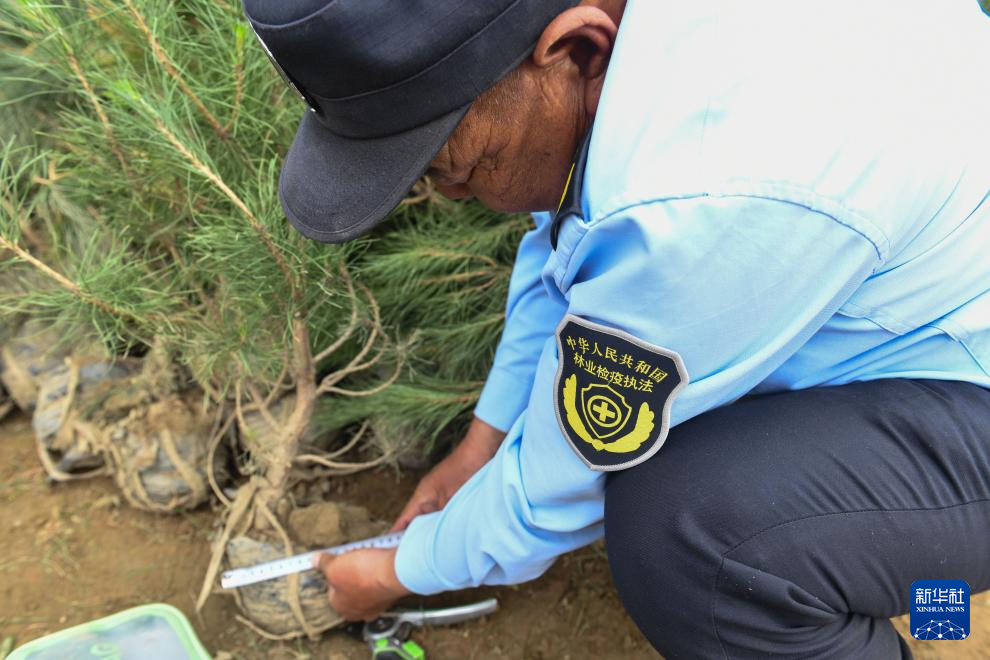 6月3日,在拉薩南北山綠化工程2024年度鞏固提升(貢嘎機(jī)場(chǎng)周邊山體)工程項(xiàng)目上,林業(yè)檢疫執(zhí)法工作人員在檢查樹(shù)苗根部土球是否達(dá)標(biāo)。新華社記者 晉美多吉 攝