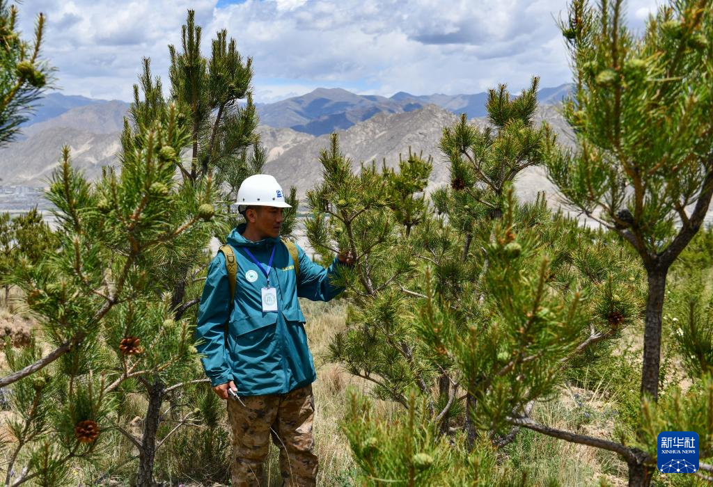 6月3日,拉薩南北山綠化工程2024年度鞏固提升(貢嘎機(jī)場(chǎng)周邊山體)工程項(xiàng)目上,第三方監(jiān)理人員在檢查樹(shù)木狀況。新華社記者 晉美多吉 攝