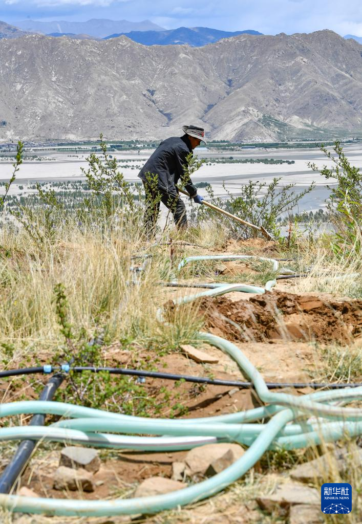 6月3日,在拉薩南北山綠化工程2024年度鞏固提升(貢嘎機(jī)場(chǎng)周邊山體)工程項(xiàng)目上,當(dāng)?shù)卮迕裨诶_貢嘎機(jī)場(chǎng)周邊山體栽樹(shù)澆水。新華社記者 晉美多吉 攝