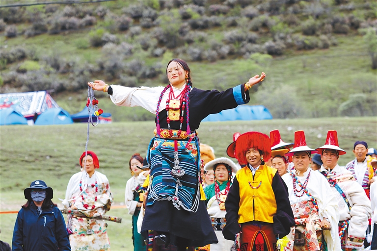 開幕式結(jié)束后,“春踏林周·悅賞杜鵑”——2024林周縣“春賞杜鵑”生態(tài)藝術(shù)共享季系列活動開始。為了給廣大游客提供專業(yè)的旅拍服務(wù),主會場的杜鵑花賞花點(diǎn)被巧妙地轉(zhuǎn)化為一個充滿自然韻味的“攝影棚”,并推出“非遺”服飾體驗(yàn),讓游客更深入地感受和體驗(yàn)當(dāng)?shù)貍鹘y(tǒng)文化的魅力。同時,圍繞林周縣北部的生態(tài)環(huán)境、藝術(shù)人文和“非遺”文化等設(shè)計開展了徒步旅游活動,活動融合“農(nóng)文旅體”等內(nèi)容,從專業(yè)性的內(nèi)容植入、技能型的活動設(shè)計等方面來增強(qiáng)徒步旅游的品質(zhì)。旁多鄉(xiāng)的達(dá)龍藏戲、唐古鄉(xiāng)的熱振曲卓、阿朗鄉(xiāng)的“果諧”還給觀眾帶來了精彩的“非遺”表演。