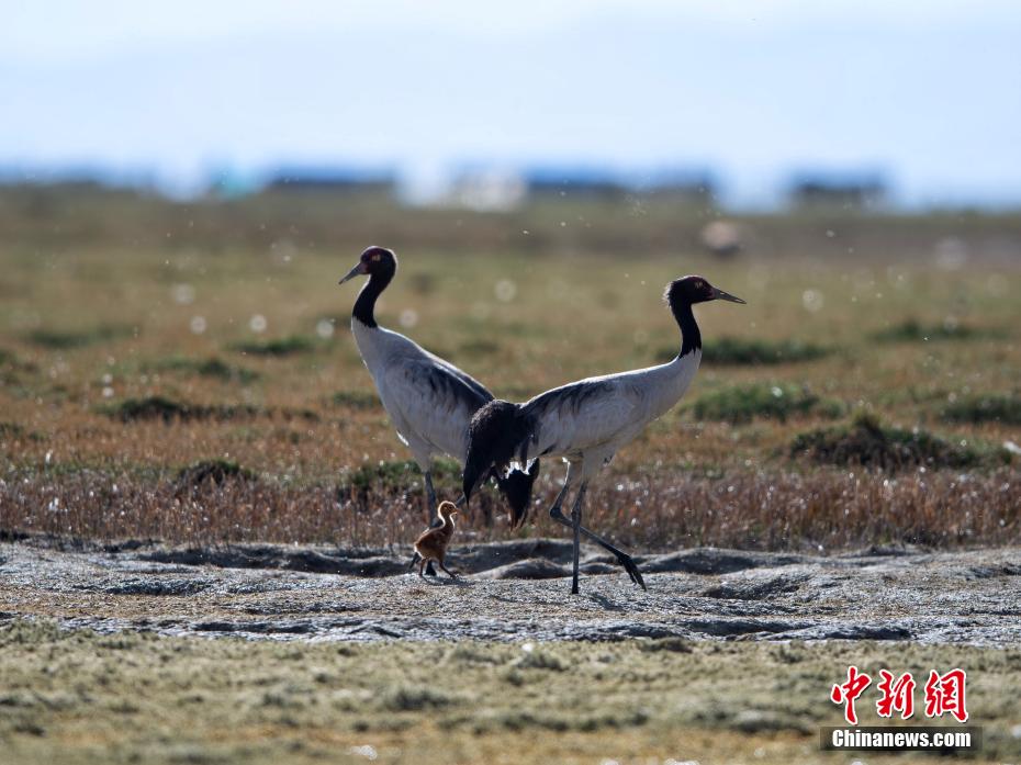 圖為黑頸鶴幼崽在父母的引導(dǎo)下在濕地里棲息、覓食。貢嘎來松 攝