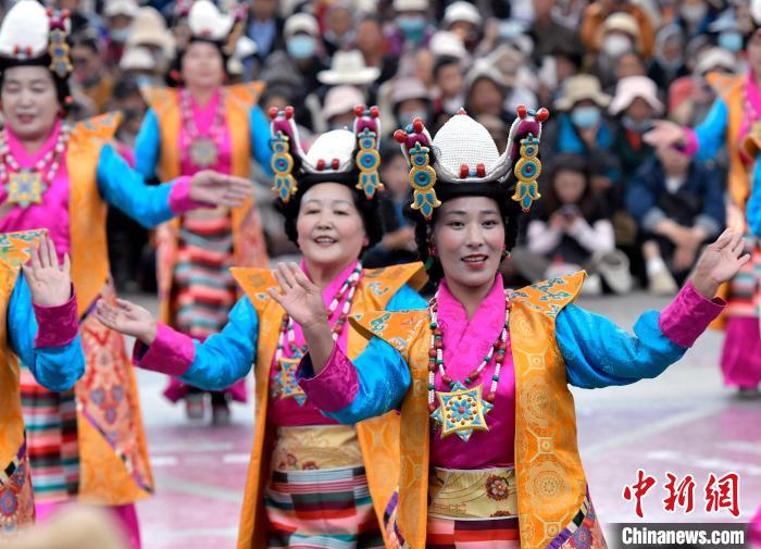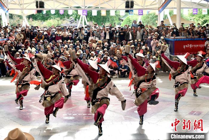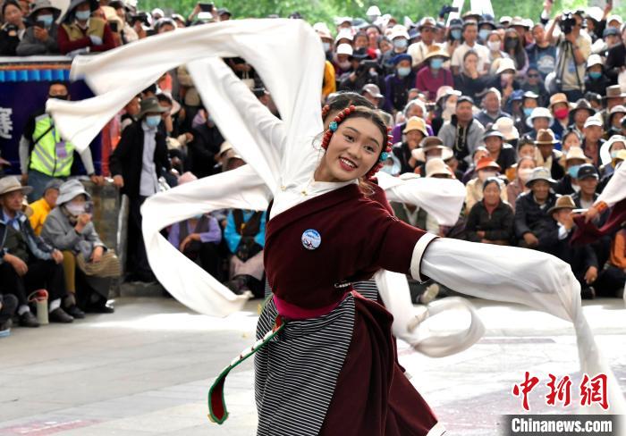 6月14日,第二屆拉薩鍋莊舞大賽決賽在布達(dá)拉宮腳下的宗角祿康公園舉辦,共有12支隊伍參賽。圖為鍋莊舞大賽決賽現(xiàn)場。中新社記者 李林 攝