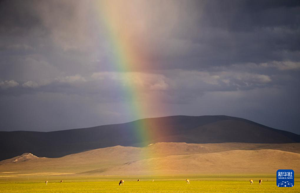 6月16日,彩虹下待產(chǎn)的藏羚羊。新華社記者 費茂華 攝