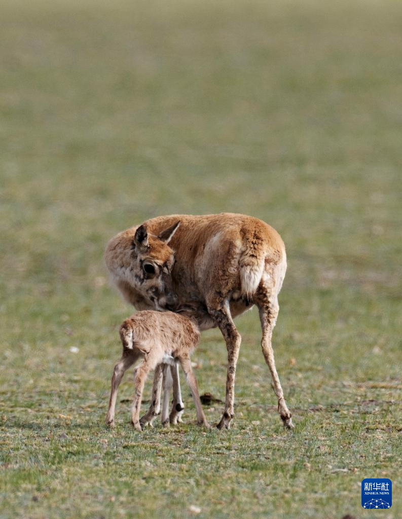 魯確塘草原上,小藏羚羊在吃奶(6月16日攝)。新華社記者 旦增尼瑪曲珠 攝??