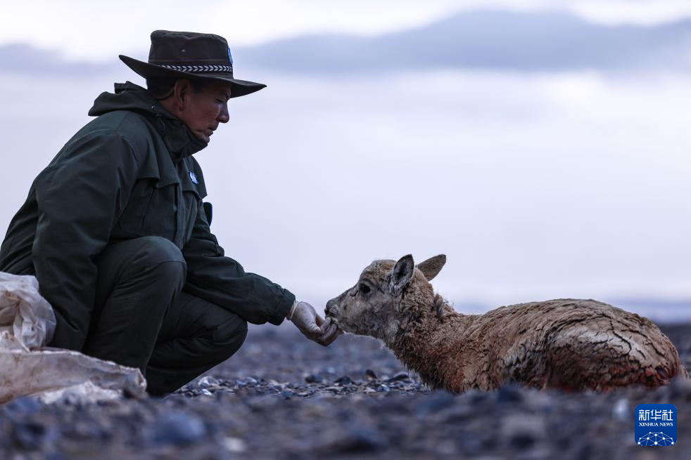 羌塘國家級自然保護(hù)區(qū)的野生動物專業(yè)管護(hù)隊員在安撫受傷的藏羚羊(6月13日攝)。新華社發(fā) 旦增 攝