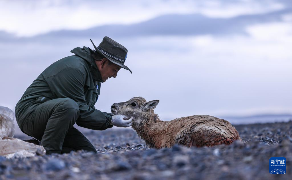 羌塘國家級自然保護區(qū)的野保員在安撫受傷的母藏羚羊(6月14日攝)。新華社發(fā)(旦增攝)