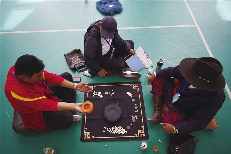 當(dāng)日,“吉韌”“秀茲”等項(xiàng)目一同開賽?! 凹g”也叫藏式克郎球,是藏族的一種彈指運(yùn)動。比賽在一張邊長約1米的正方形木桌球臺上進(jìn)行,球臺四角有4個小洞,黑、白兩種扁圓形球子各9個,另有1個紅色球子放置在球臺中心,1個白色母球供雙方彈擊球子所用。