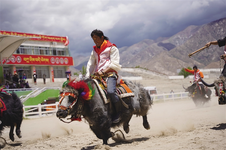 此時,賽場另一邊傳來歡呼,循聲望去,原來是本屆運(yùn)動會的賽牦牛正在進(jìn)行。雖然牦牛生性溫和,但讓它們聽命令奔跑,也并不容易。記者了解到,參加本屆運(yùn)動會的牦牛均由主人精挑細(xì)選,主人一聲吹哨,輕微地蹬腳,牦牛就會按指令向前行進(jìn),顯得默契十足。但偶爾也會發(fā)生小狀況,比如牦牛分不清方向擠成一團(tuán),跑著跑著就停頓休息,或者原路返回等,引得觀眾頻頻發(fā)笑。