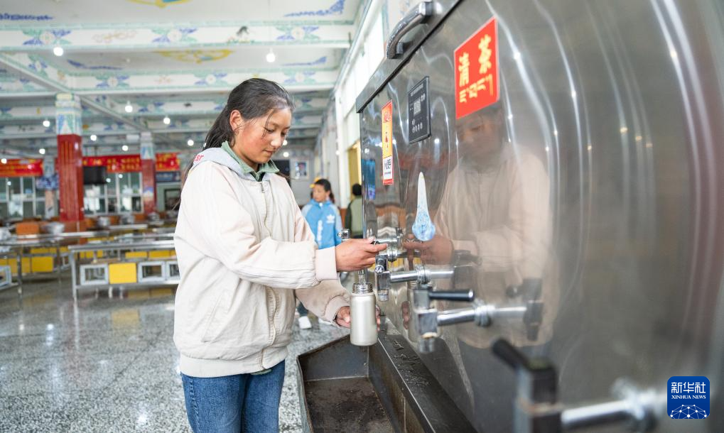 班戈縣中石化小學(xué)學(xué)生旺青拉姆用水杯接清茶(6月22日攝)。新華社記者 丁增尼達 攝