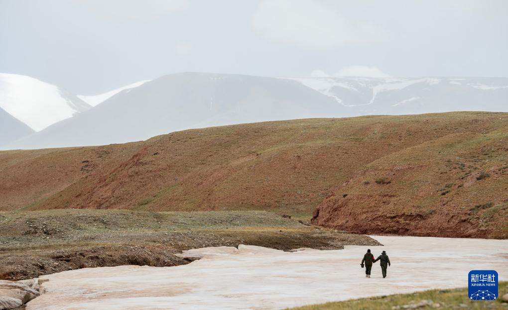6月15日,羌塘國(guó)家級(jí)自然保護(hù)區(qū)野生動(dòng)物專業(yè)管護(hù)隊(duì)員索朗(右)和羅布檢查河面冰凍情況。新華社記者 費(fèi)茂華 攝