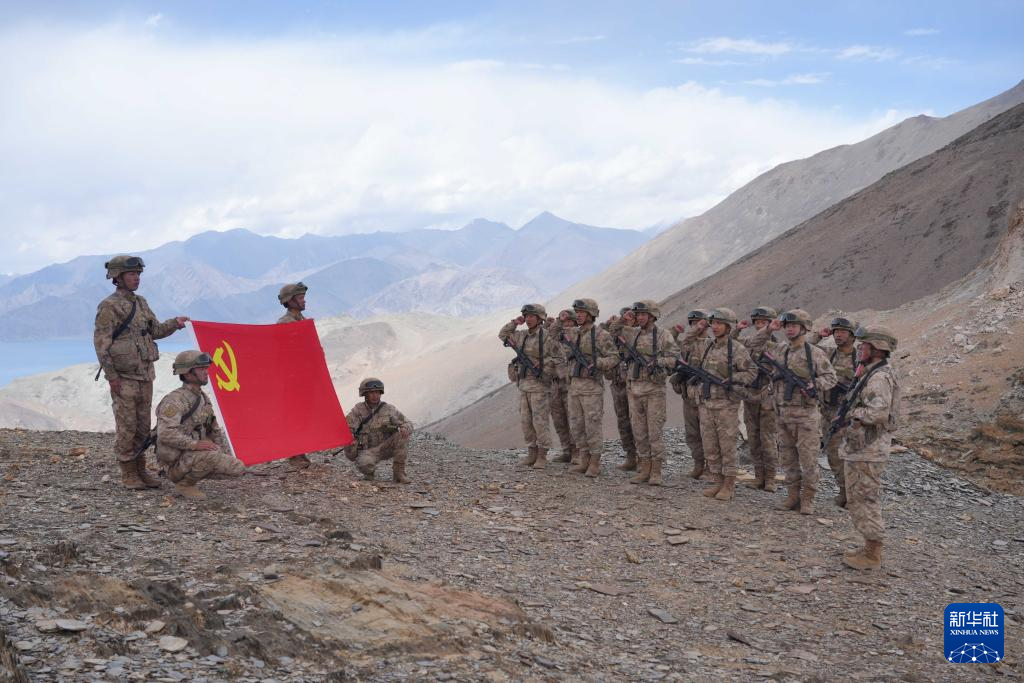 西藏阿里軍分區(qū)普爾楚邊防連秋迪儉革拉哨所巡邏官兵在海拔5700米的巡邏點位組織重溫入黨誓詞活動(6月29日攝)。新華社發(fā)(戴學(xué)武 攝)