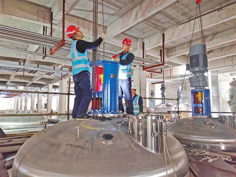 圖為西藏安琪生物科技有限公司工作人員在吊裝生產設備。