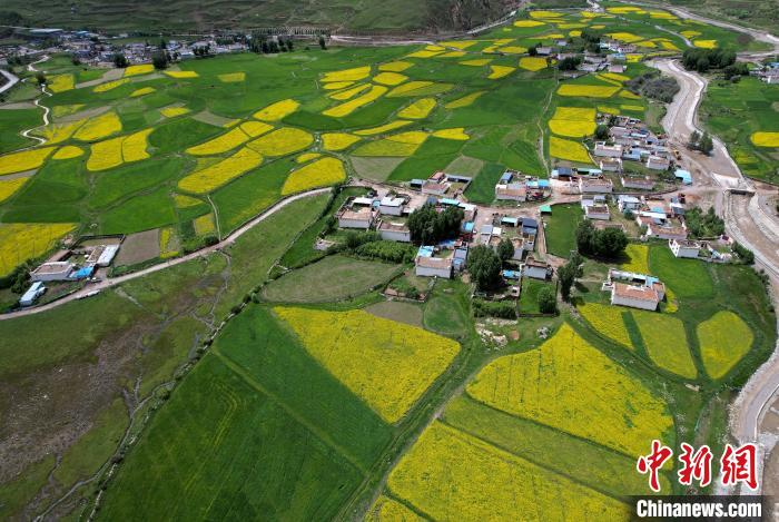盛夏,西藏墨竹工卡油菜花盛放,一片金黃,風(fēng)光宜人。油菜花與綠油油的青稞地以及藏式民居,共同繪就鄉(xiāng)村美麗畫卷。圖為7月10日,拉薩市墨竹工卡縣油菜花盛放。(無人機(jī)照片)中新社記者 李林 攝