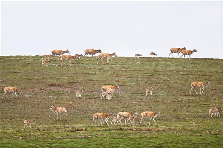 卓乃湖位于世界自然遺產(chǎn)地可可西里腹地。今年5月以來,來自青海三江源、新疆阿爾金山、西藏羌塘等地的雌性藏羚羊陸續(xù)遷徙至卓乃湖區(qū)域產(chǎn)仔。7月下旬開始,產(chǎn)仔結束后的雌性藏羚羊將再攜幼仔返回原棲息地。