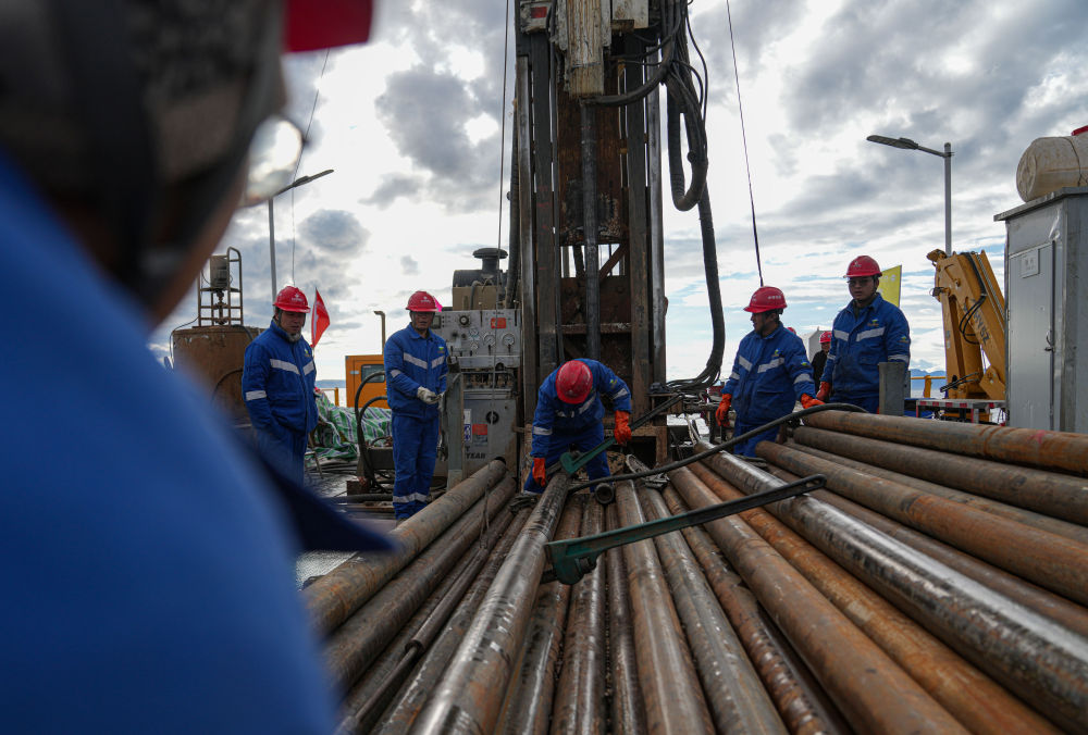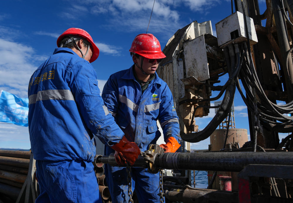 7月11日,鉆探隊隊員在準備增加孔內(nèi)鉆桿。新華社記者 晉美多吉 攝