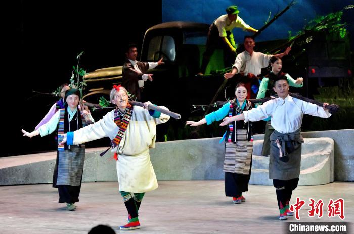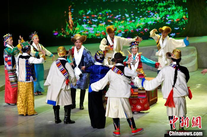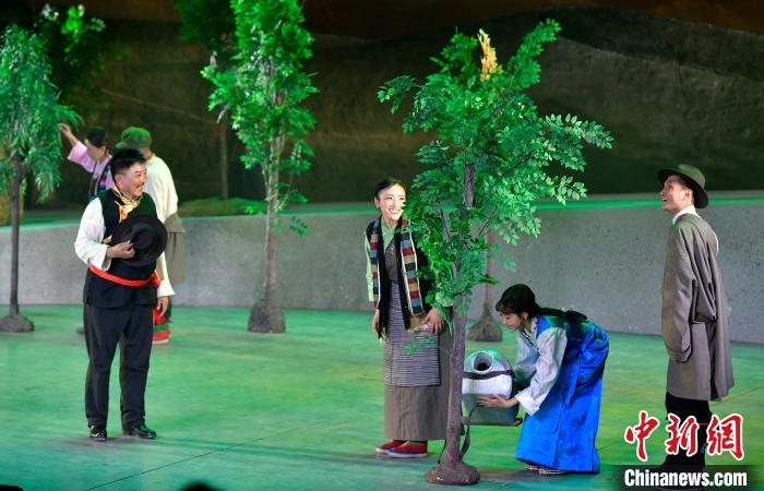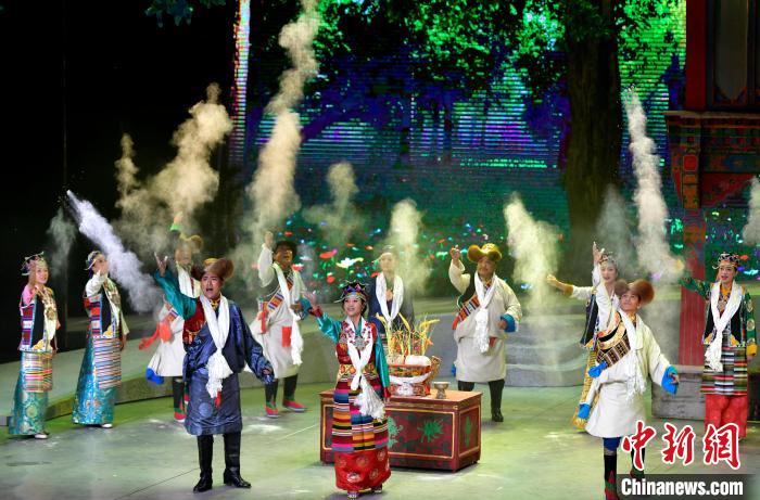 7月13日晚,由西藏自治區(qū)藏劇團打造的新編現(xiàn)實題材藏戲《綠色哈達》在拉薩開演。該劇將傳統(tǒng)藏戲元素與現(xiàn)代舞臺表現(xiàn)手法相結(jié)合,展現(xiàn)了西藏通過實施“一江兩河”等工程形成的高原生態(tài)治理成效。圖為演出現(xiàn)場。中新社記者 李林 攝